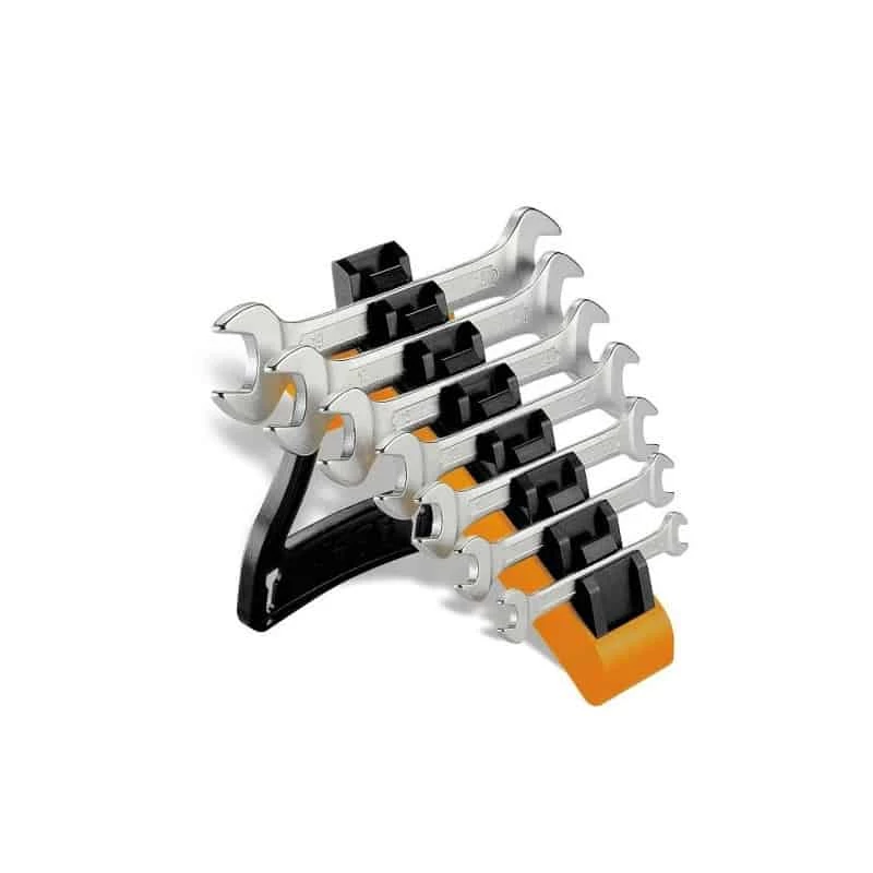 Assortiment de 7 clés à fourches livrées sur leur support pratique et fonctionnel. Détail du lot: 6 x 7 – 8 x 9 – 10 x 11 – 12 x 13 – 14 x 15 – 16 x 17 et 18 x 19 mm