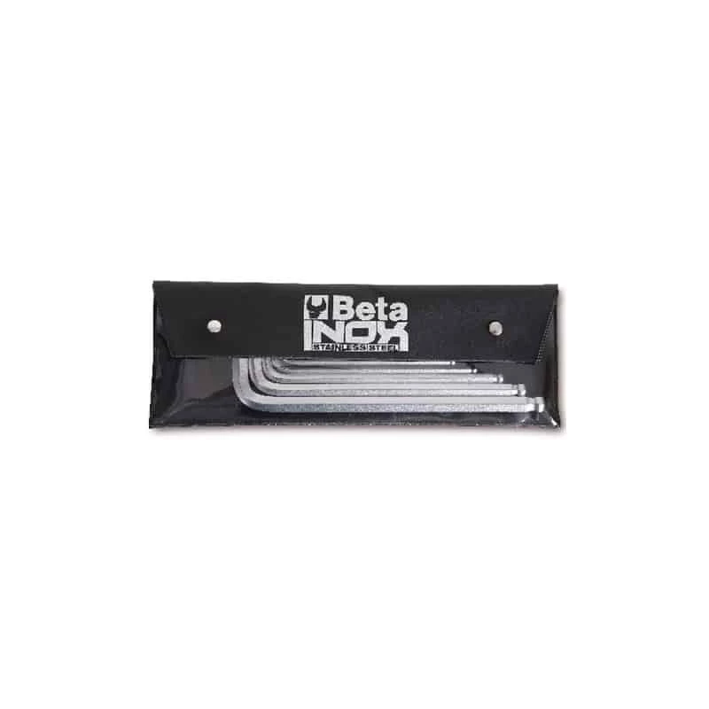 Assortiment de 7 clés mâles 6 pans coudées à tête sphérique, en acier inoxydable, conditionnées en trousse plastique. Dimensions: 2,5 – 3 – 4 – 5 – 6 – 8 et 10 mm