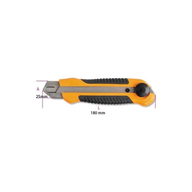 Cutter à lame sécable de 25 mm, poignée avec structure interne en acier inoxydable, manche bimatière antidérapant.