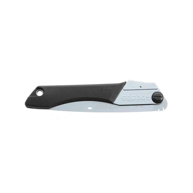 La poignée en caoutchouc de la Gomboy assure une bonne prise en main confortable. Le trou de la poignée permet de passer un mousqueton ou corde à la scie.