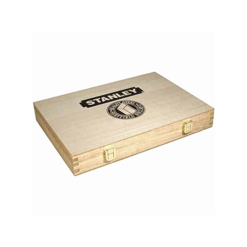 Ce joli coffret en bois STANLEY contient 5 ciseaux à bois avec un manche en bois protégé par un vernis incolore et renforcé par 2 viroles en acier nickelé.