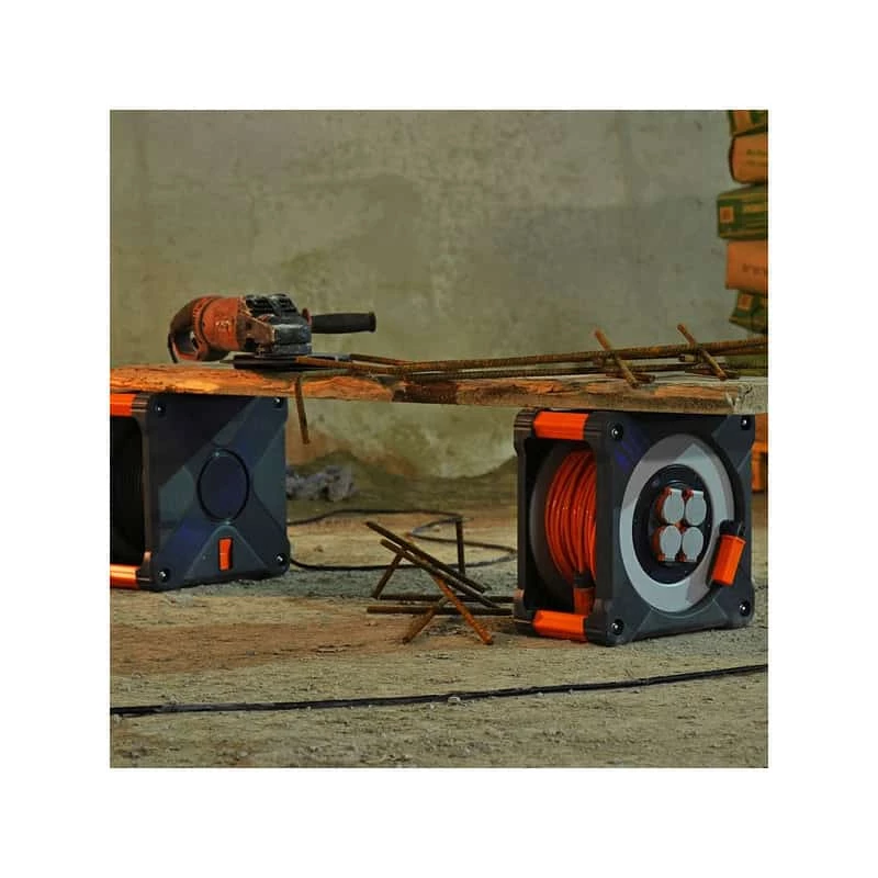 L’enrouleur de câble Brennenstuhl référence 9202251100 fait 25 m de long. Sa forme de cube offre une grande stabilité un un bon guidage du câble sur les 4 côtés. Sur chaque angle du cube, une poignée de transport robuste est adaptée aux conditions de travail sur les chantiers. Egalement sur chaque angle, des trous de rangement de la fiche permettent un transport protégé. Un bouton frein de tambour permet de bloquer l’enrouleur pour que le câble ne se déroule pas involontairement durant le transport.