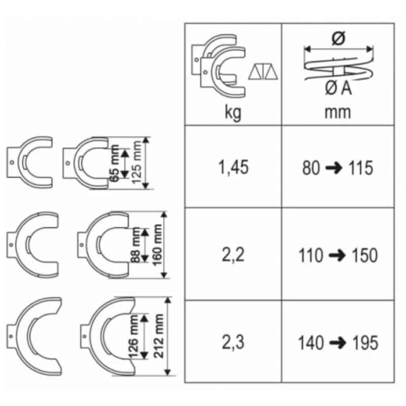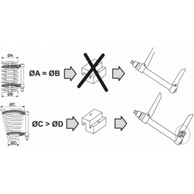 Le compresseur de ressort E201001 possède 3 paires de griffes équipées d’une protection plastique interchangeable pour éviter d’endommager la peinture du ressort. La course de compression est de 300 mm et la longueur du corps de 453 mm. La puissance maximum du compresseur sont de 10200 N (environ 1 tonne). Il possède 6 pans d’entrainement 24 mm. Le compresseur est livré avec accessoires d’adaptation pour ressort conique et livré en coffret plastique avec notice. Il pèse 14.30 kg.