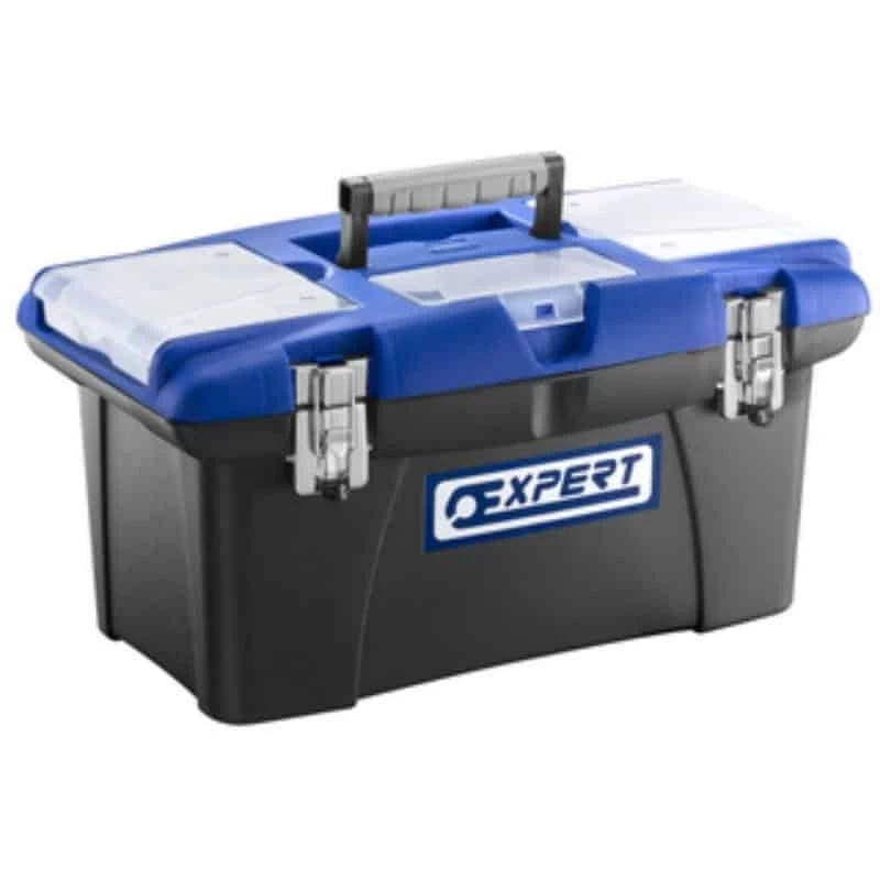 Une boîte à outils en plastique avec un plateau amovible à l’intérieur. Le couvercle est muni de 3 compartiments pour le rangement des petites pièces donc 2 amovibles et la capacité de charge de la boîte est de 10 kg.