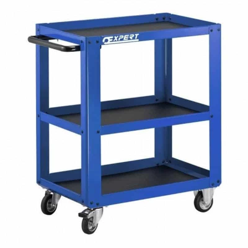 La servante est composée d’une poignée de manœuvre confortable. Il y a 2 roues pivotantes et 2 fixes Ø 80 mm pour un déplacement et une manutention aisés. Elle peut supporter une charge maximum de 200kg. La servante est constituée d’un plan de travail et étagères avec rebords qui évite la chute d’outils et équipés de tapis antidérapants en caoutchouc.