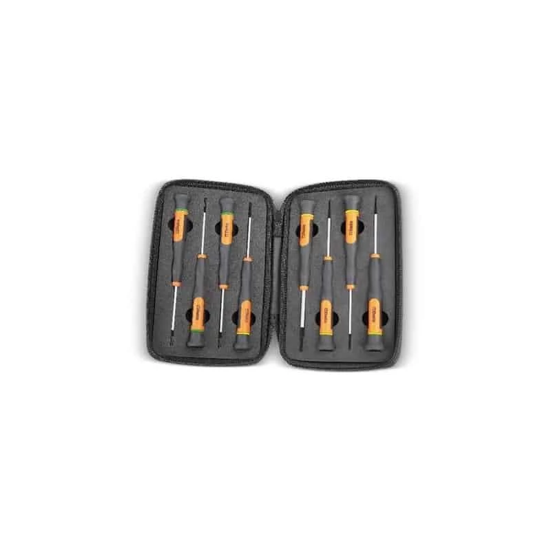 Assortiment de 8 micro- tournevis, présentés en trousse. Empreintes Phillips PH et Fente LP