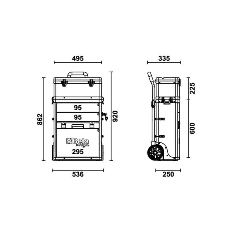 – 2 modules séparables : 1 coffre supérieur, 1 module avec 2 tiroirs de 95 mm de haut, 1 tiroir amovible en matière plastique de 66 mm de haut et 1 tiroir de 295 mm de haut