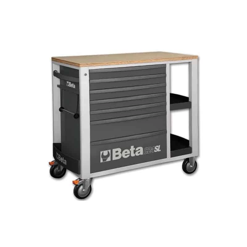 Servante mobile d’atelier à sept tiroirs et tablettes latérales. Les tiroirs sont montés sur glissières à billes de précision. Le plateau des tiroirs est protégé par un tapis en caoutchouc souple. Deux roues fixes et deux pivotantes, deux sont équipées avec frein. Serrure centralisée frontale. Plan de travail en bois contre-plaqué stratifié avec trous pour l’installation d’un étau (1599F/100 en option). Compartiment latéral avec tablette réglable en hauteur. Porte-papier incorporé et double porte-flacons arrière.