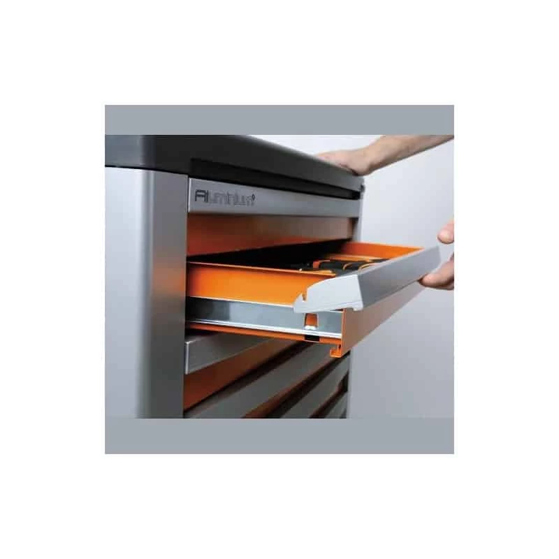 Capacité de charge statique: 1200 kg. Plan de travail thermoplastique. Six tiroirs de 588 x 367 mm, montés sur glissières à billes de précision Fond des tiroirs protégé par un tapis en Néoprène. Montants et façade du tiroir en aluminium Quatre roues, 2 fixes et 2 pivotantes dont une avec frein Verrouillage de sécurité centralisé frontal. Système d’ouverture positionnée sur toute la longueur du tiroir. Porte-flacons latéraux et arrière incorporés. Support rouleau de papier intégré. Poids: 55 kg